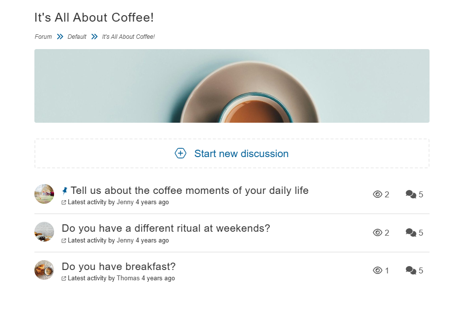 The Forum module is used as a bulletin board to host discussions on various topics. As a Moderator, you can create new boards in the Admin and add new discussions in these forums on the Front-End to which the participants can reply. Participants are able to create discussions themselves and report inappropriate content through the Flag button.