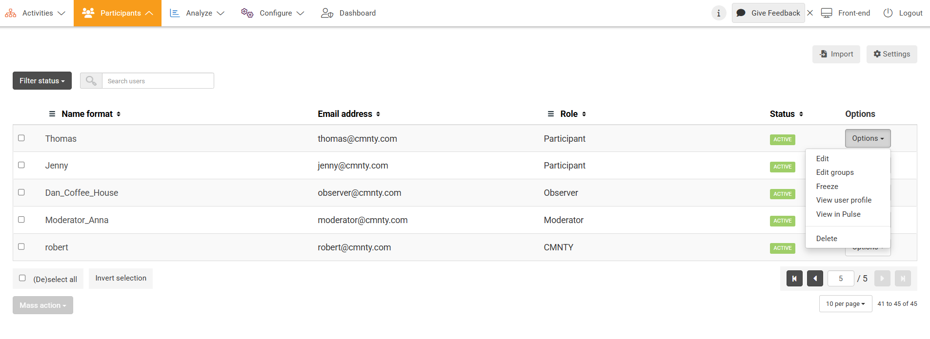 Moderators have access to the Admin section of CMNTY Platform and can change settings, create content, invite users, etc. Moderators are also able to do a few things in the front-end that other roles cannot. Moderators can see expired, draft, and scheduled items, they can delete and edit other participant’s content, they can manually reward and remove points and badges, they have access to the extra options on participant profile pages (point history, time spend, history, and device history), they see activities of all participants, and they can see user groups. Other permissions can be changed with the permission system. - Observer role