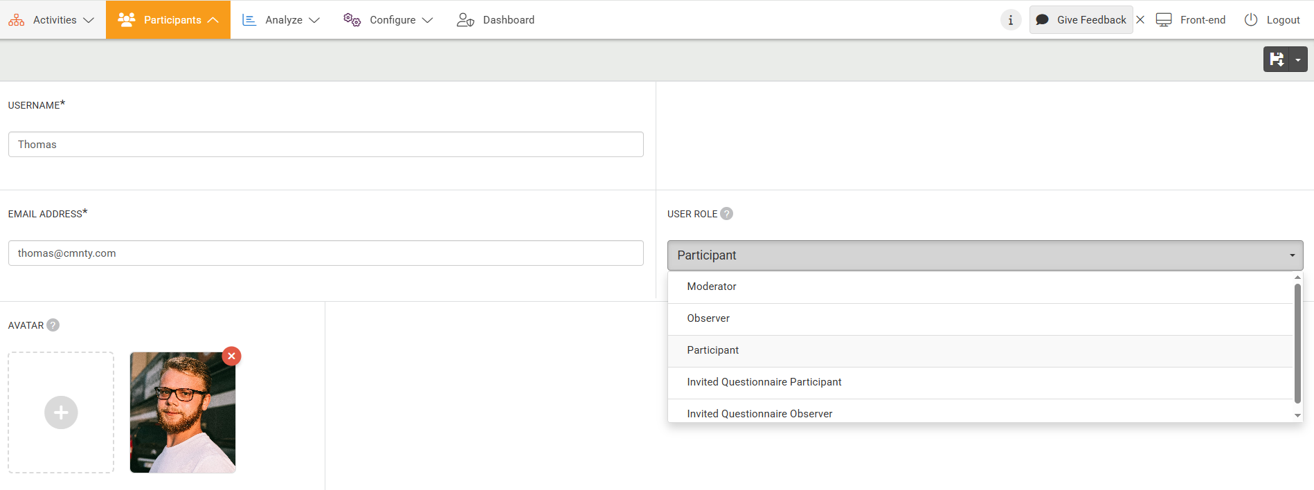 The participant role is intended for project participants. Participants can only see active items on the front-end, can only edit and delete their own content, and can only see their own journal entries (and responses from moderators). Other permissions can be changed with the permission system. - Unkown role