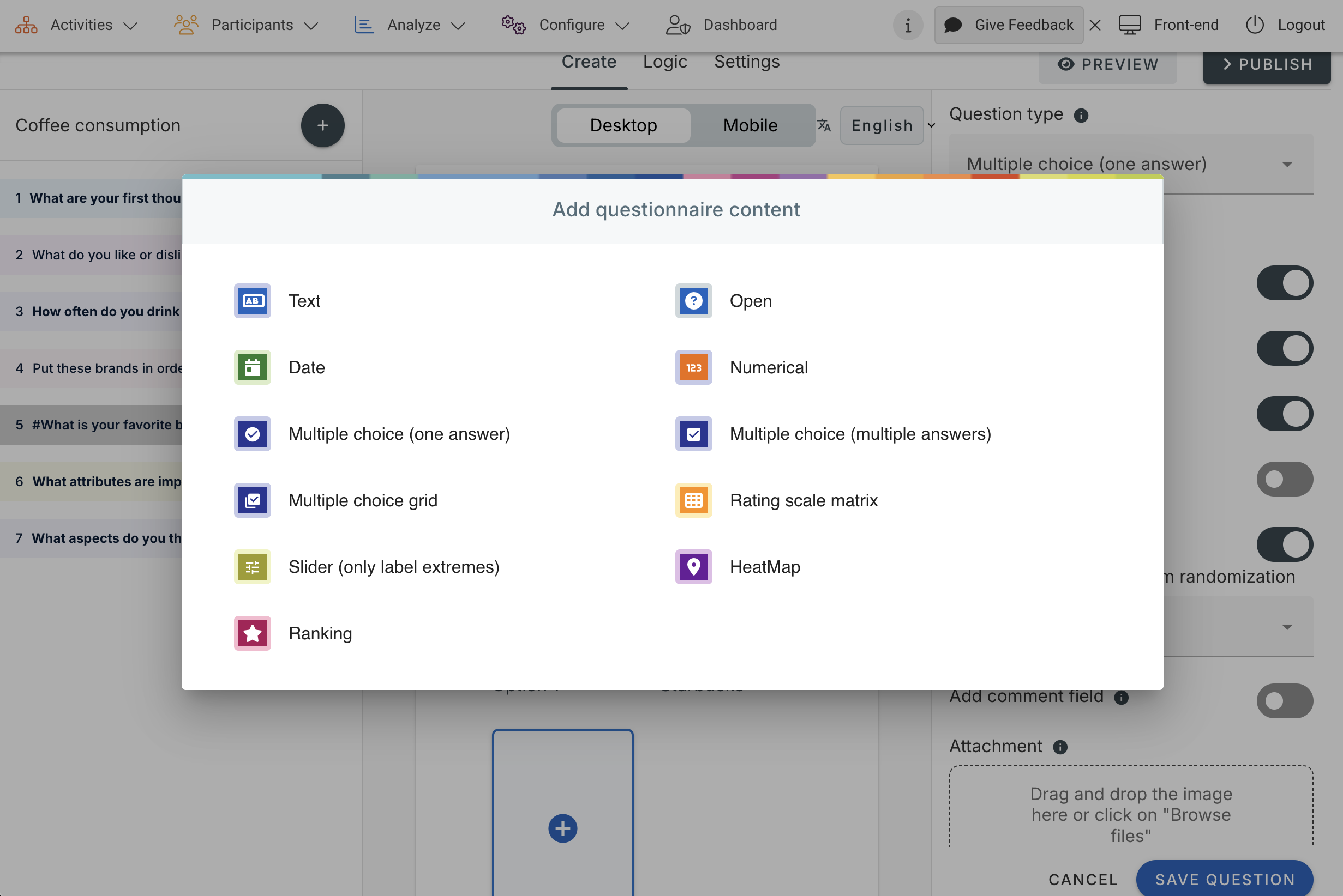In the Questionnaire Module, you can choose the question types: multiple choice questions, multiple choice grids, rating scale matrices, and slider questions. Also, you can provide multiple answer rows, labels, or grid choices. You can do this by following the steps below: