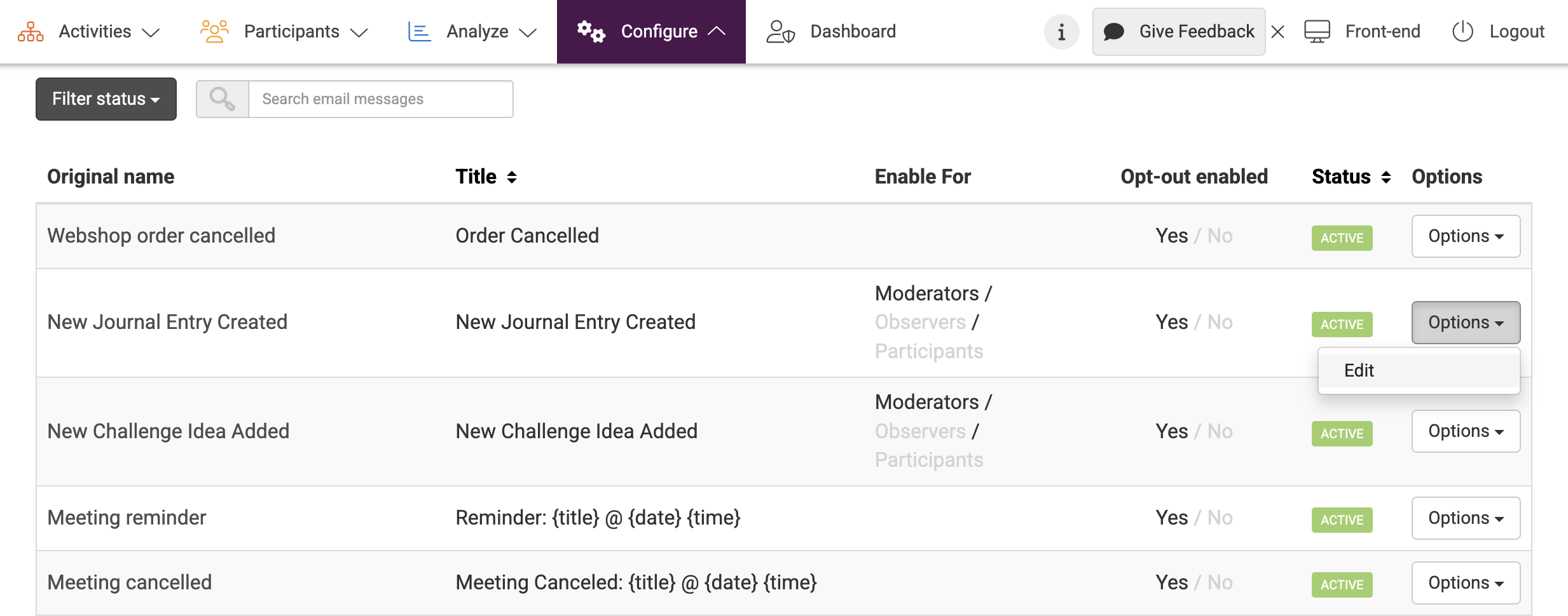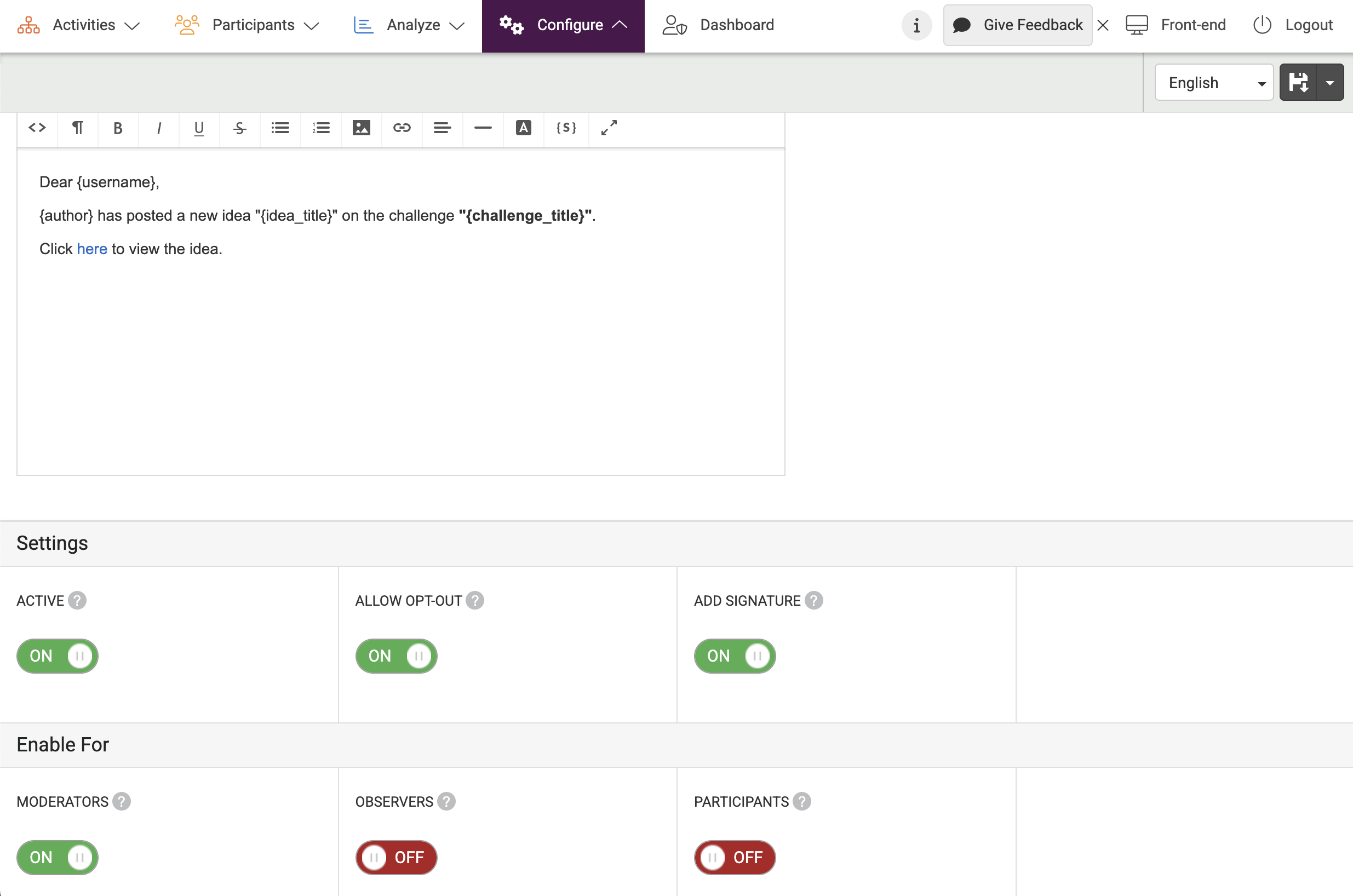 - Activate to allow users to (un)subscribe by turning the ‘Allow opt-out’ switch to ON. Deactivate the opt-out possibility for this notification email by turning the switch to OFF.