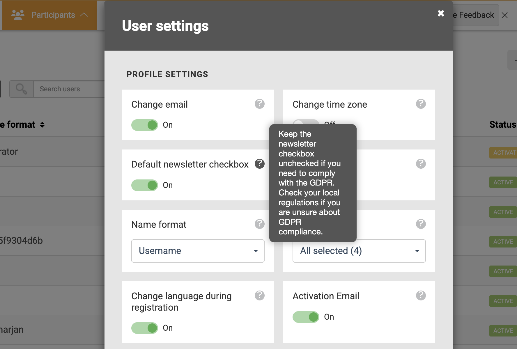 - Go to Participants at the top menu in Admin.