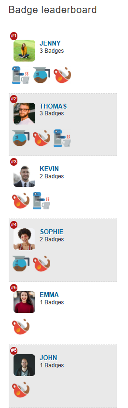 The Badge Leaderboard widget shows a list of members with highest scores of badges and displays this list in descending order (i.e. highest scorer is always listed on top). This is how the widget looks like: you can set-up Badge Leaderboard widget by following the steps in this article.
