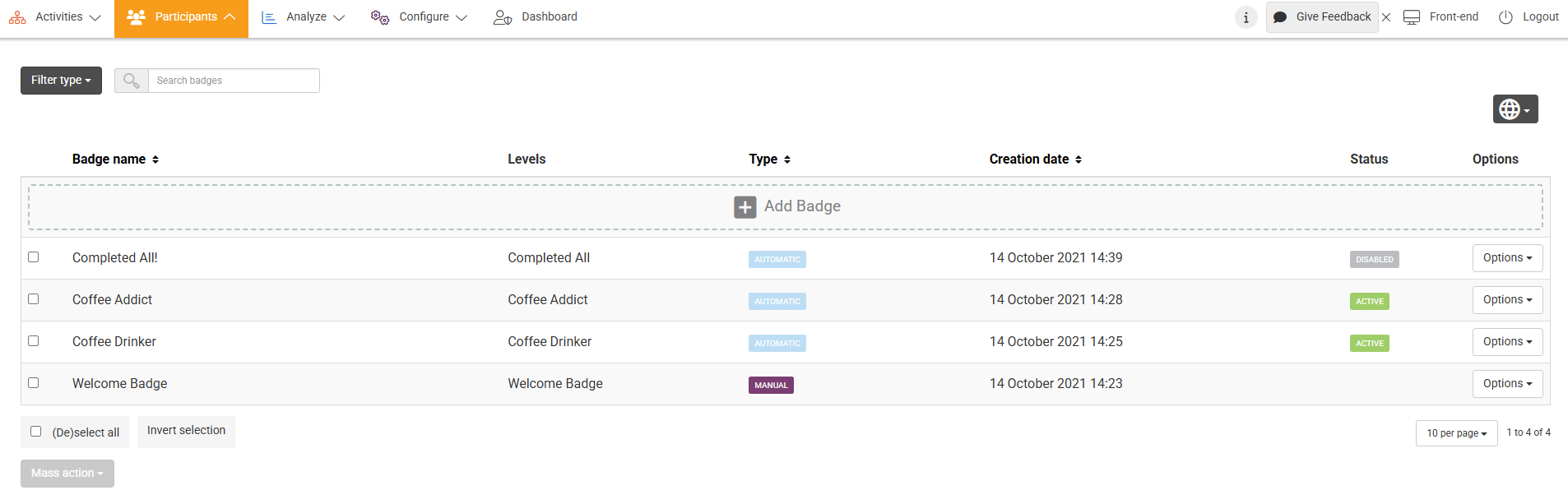 - When a badge is active, choose Deactivate in the Options drop-down menu. When a badge is deactivated, you can choose Activate.
