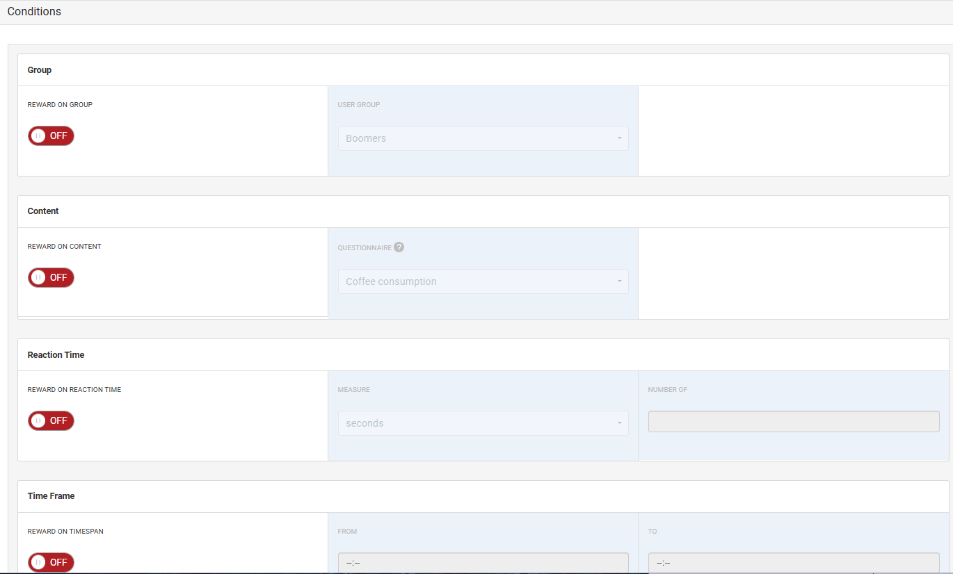 - There are various Conditions that you can apply to a badge. You can reward a certain badge to a user group, create a badge specifically for a gamification category or content, or earn a badge based on reaction time and/or time frame.