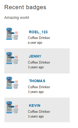 The Recent Badges widget shows the Badges users have recently earned. This is how the widget looks like: you can set-up the Recent Badges widget by following the steps in this article.