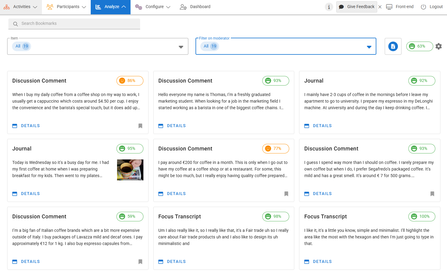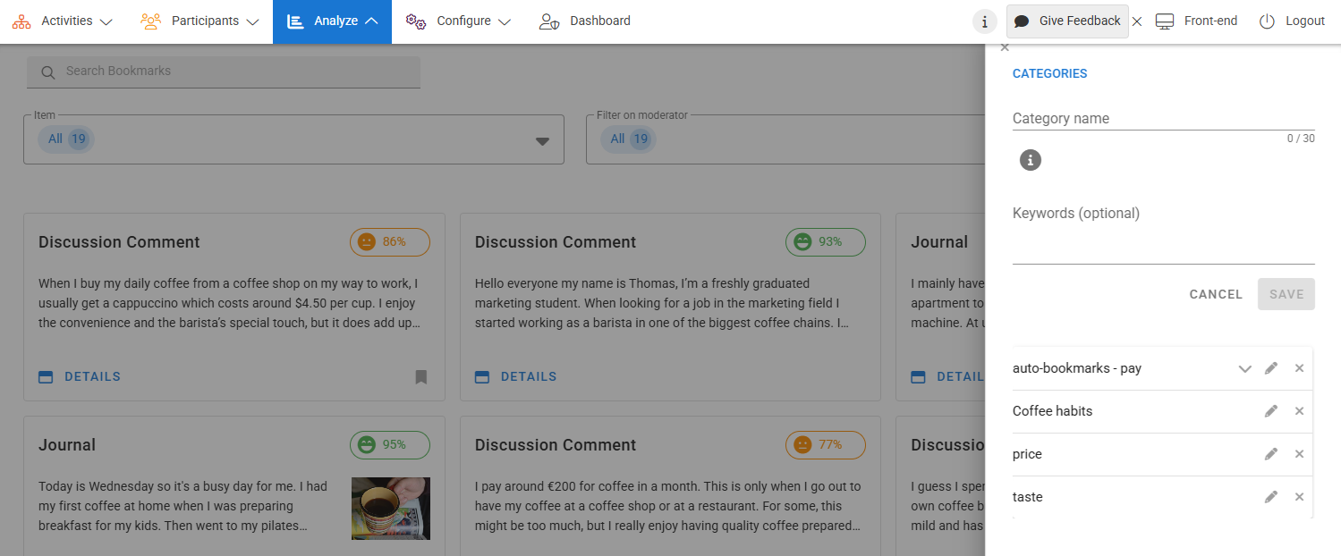 You can categorize manual bookmarks for the personalized organization of content you want to review in the future. Categories are set and can be created in the front-end with filters based on categories available within Analyze > Qualitative Analysis section.