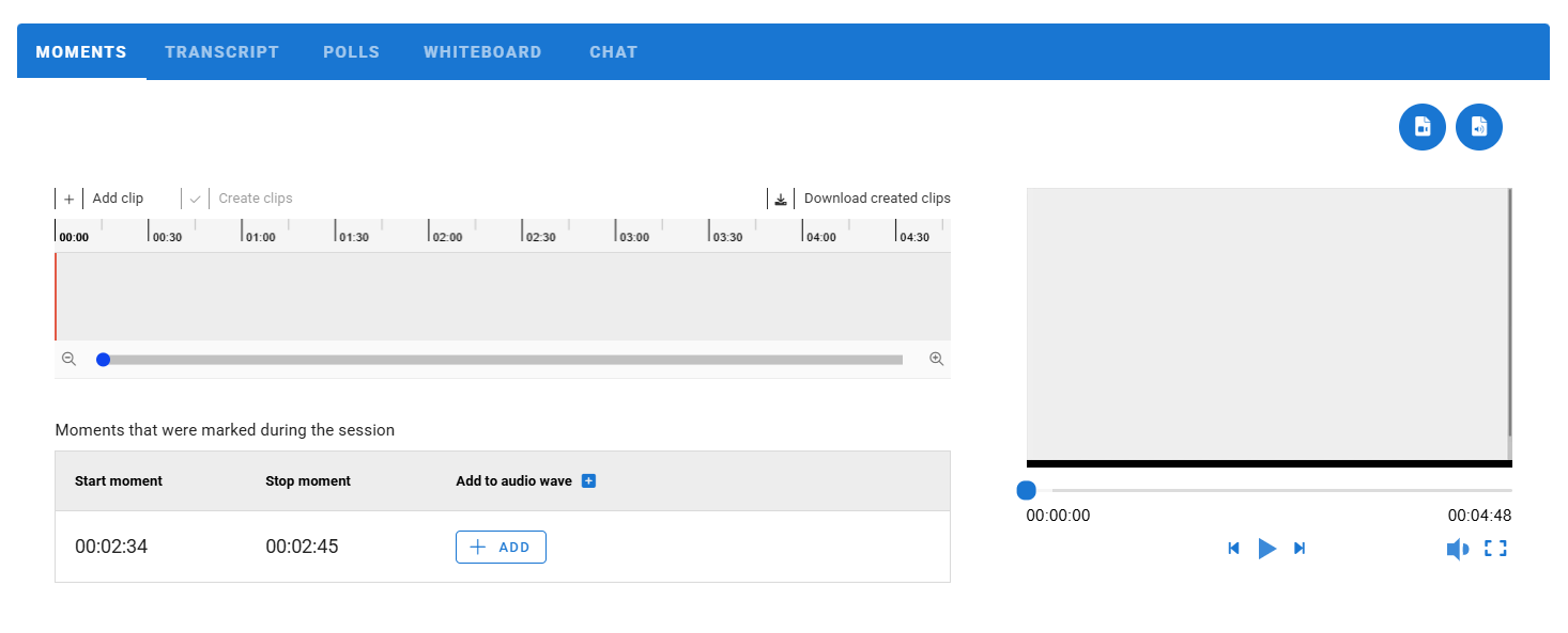Moments saved during the sessions are available for creating clips. Polls and Whiteboard results are available for review after the session.