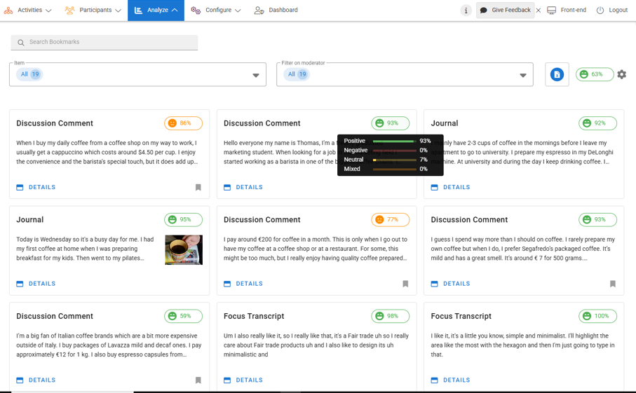 You can review sentiment analysis for a category or individual post, allowing you to instantly see if people are sharing a positive, negative, mixed or neutral feeling about the topic of discussion. Hover over the Sentiment icon to see a breakdown of the sentiment within a given category.