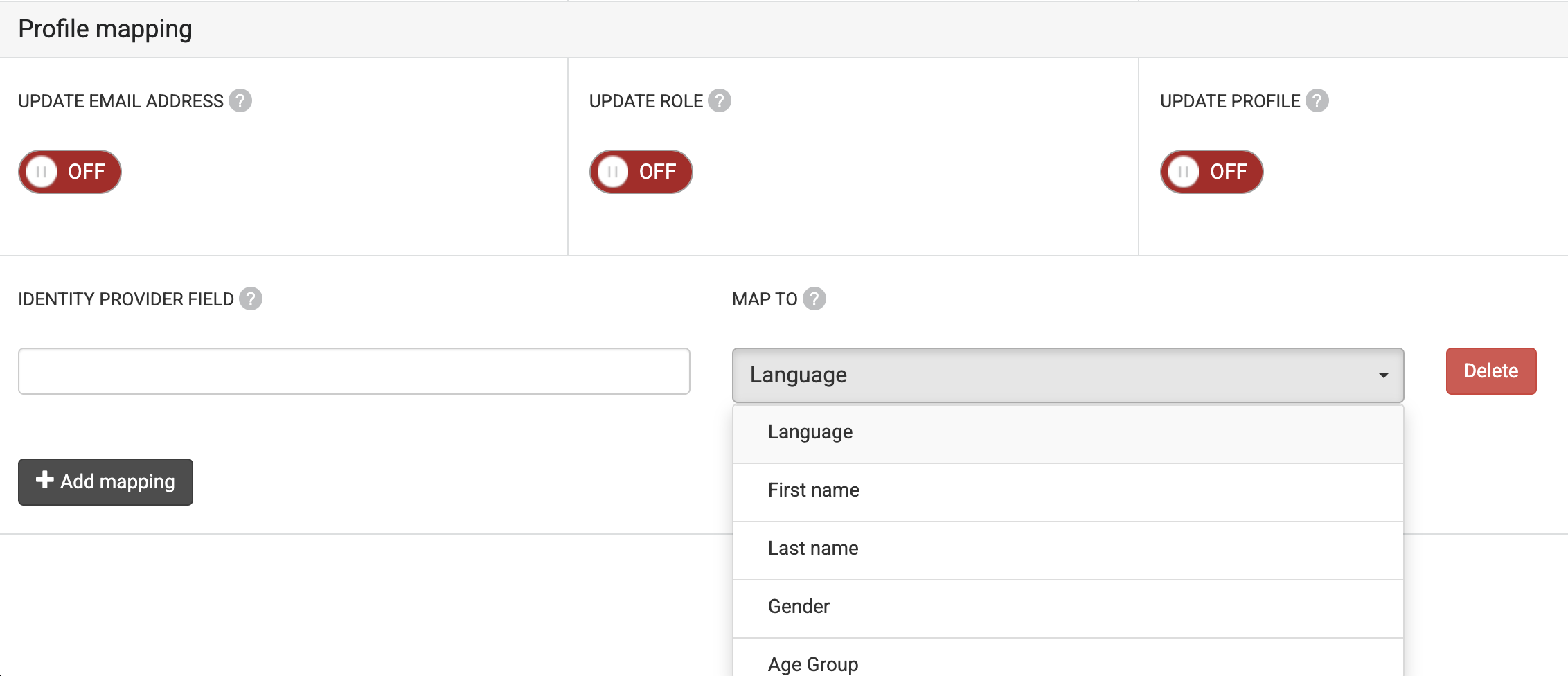 This is really useful if you want to send user profile data to the platform. Add the data key in the Identity Provider Field and select a Profile Field in the drop-down. Make sure that your identity provider sends the data key and it’s value along within the SAML response to CMNTY Platform.