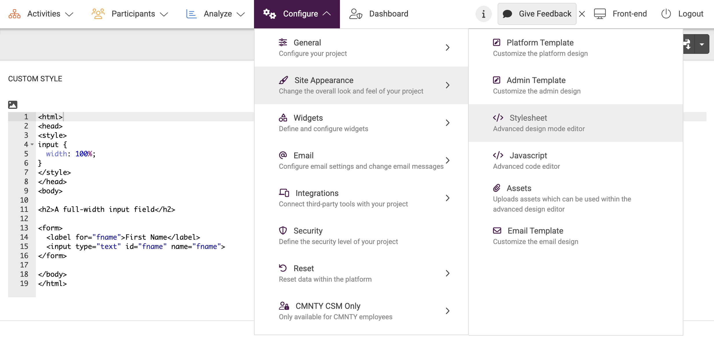 The platform specific, or Custom CSS, can be entered in the Admin section of the platform by following the steps below: