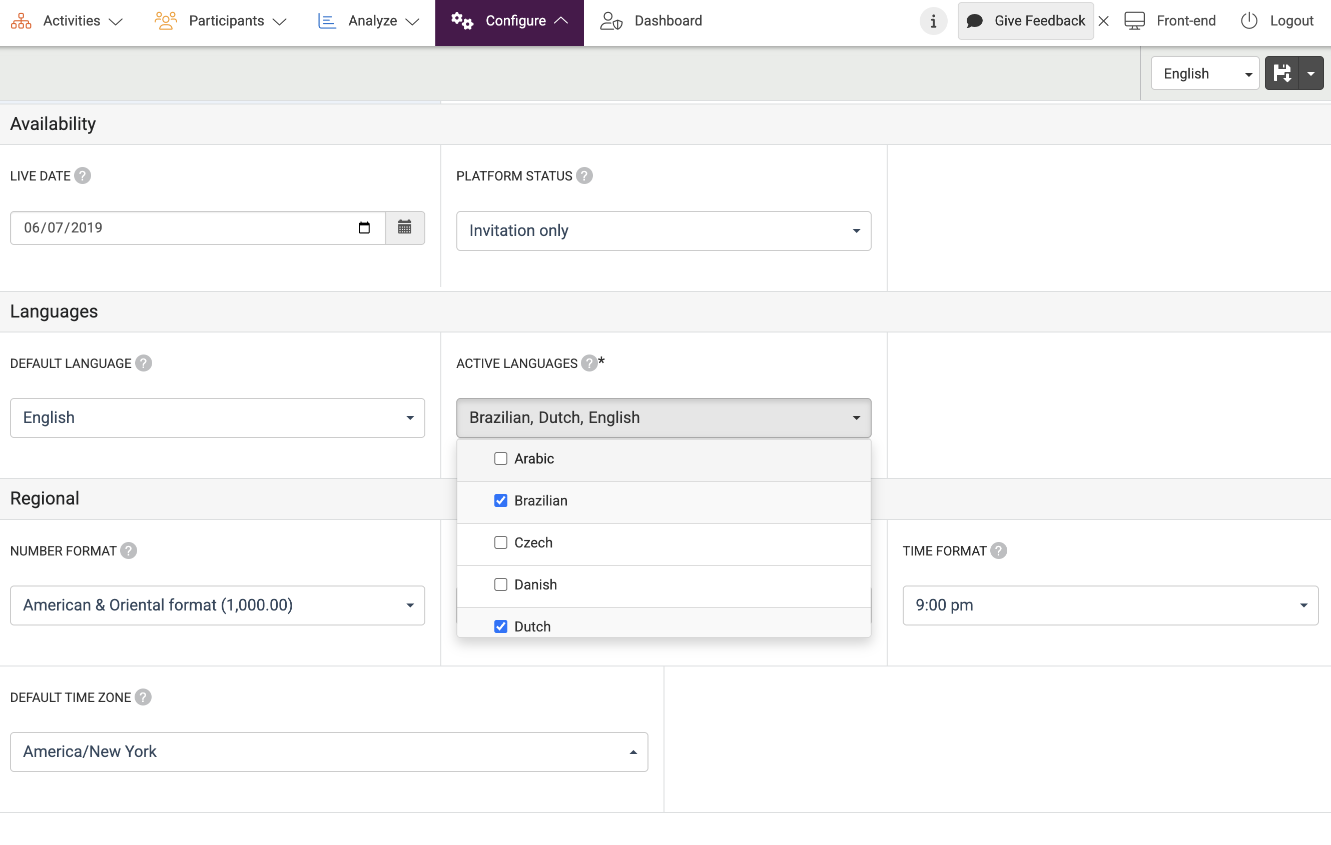 The Default Language is the standard language of the platform. For example, if you use multiple languages, and a user has not selected one yet, the default language is used. The default language can be changed at:
