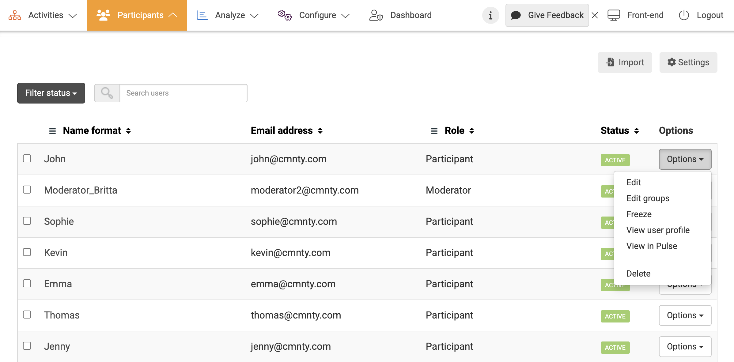 - In the Options drop-down menu next to a user, choose Delete.