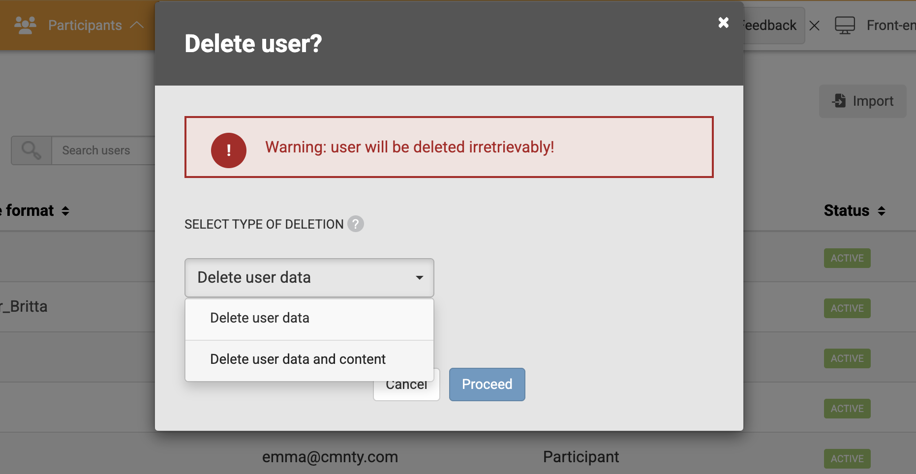 - You will see two options for deleting user data and content. Delete user data will remove user profile data but will keep all of the content they contributed (i.e. forum posts, comments on your blog, etc.). Since there will no longer be a user associated with each piece of content, the author will just appear anonymous. You will see that the content is posted by [deleted]. Also in export, you can find all export data together with username [deleted] and user ID 0. Delete user data and content will remove user profile data as well as any content they contributed to your community.