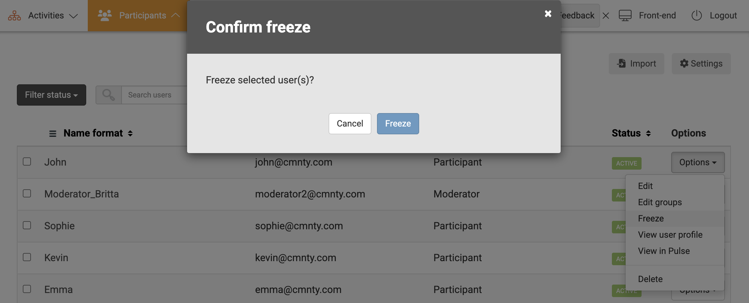 - Choose Freeze in the drop-down menu. When a user is frozen you will see that the username will be struck-out in the User Management overview.