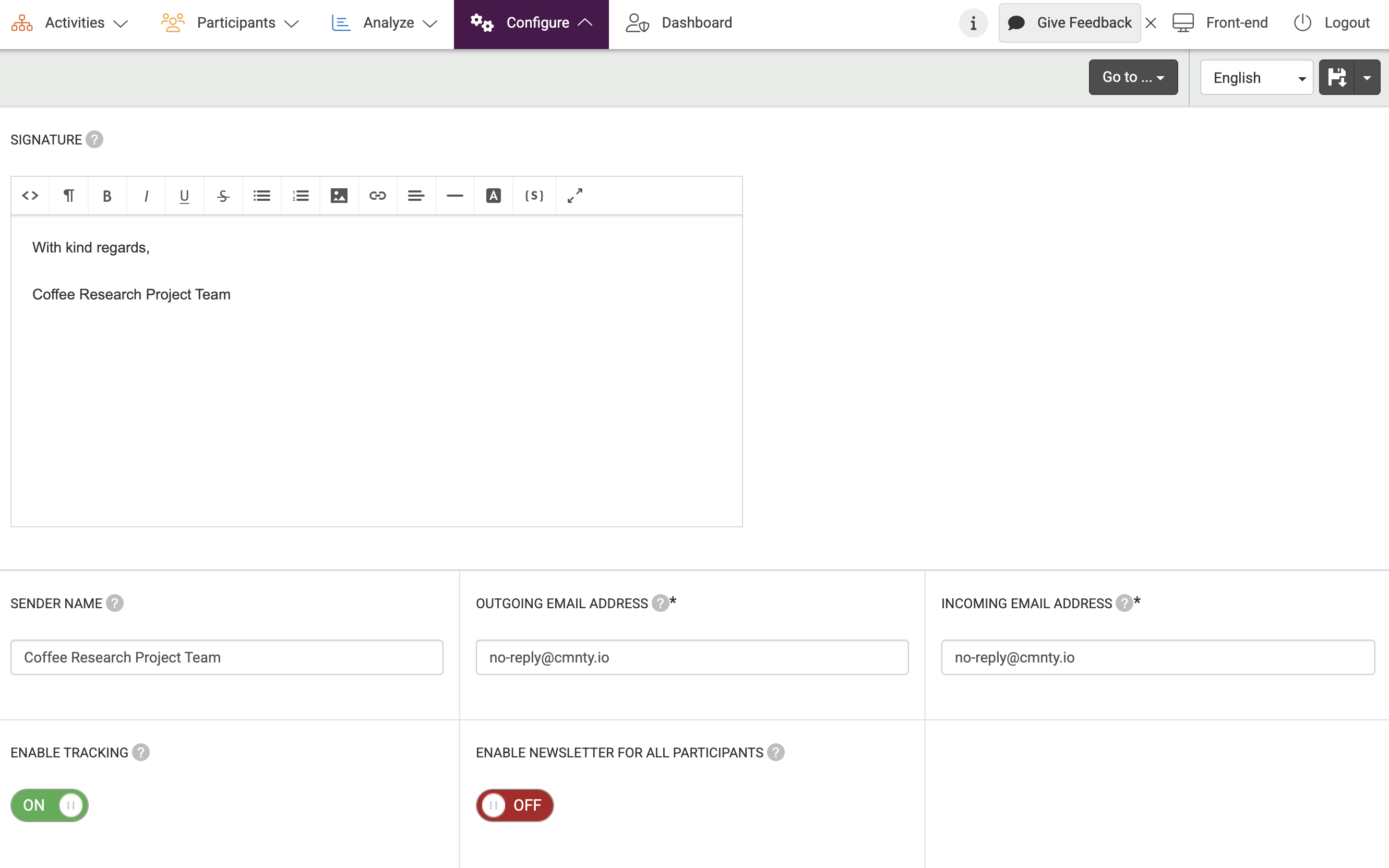 - Then, to change the email addresses and signature go to Email Settings. Add the signature that you want to display on each email that will be sent from the platform.