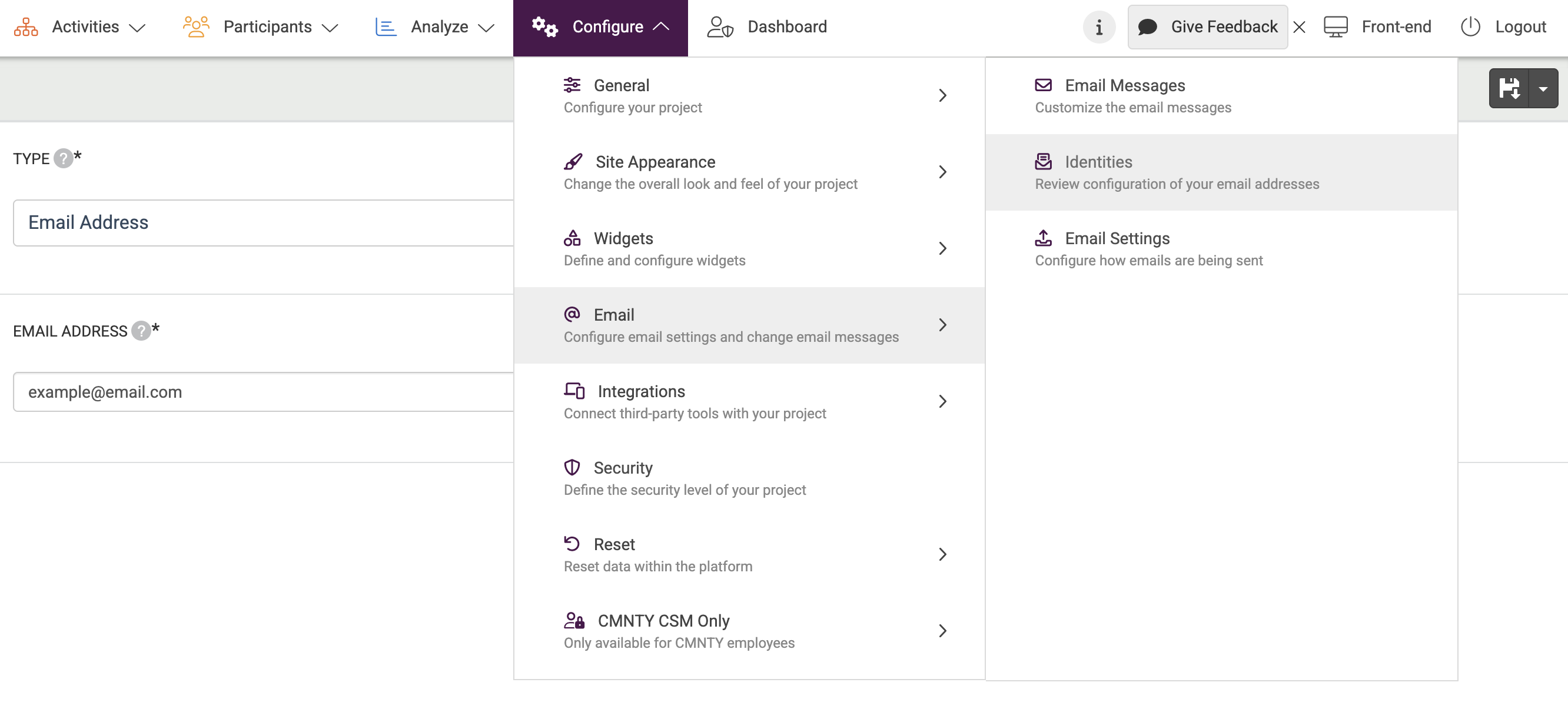 Adding an email or domain to send platform emails can only take a few minutes to set-up and can be configured with little wait time. To begin set-up, go to Configure > Email > Identities.