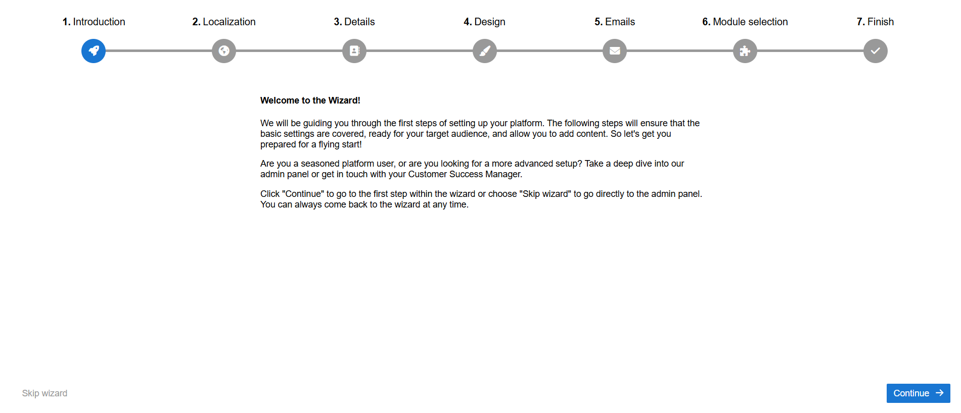 The configuration wizard is in the Admin section of the platform. It’s a to-do list with the most important steps that every moderator should know about when setting up CMNTY Platform. We hope the wizard saves you time getting started.