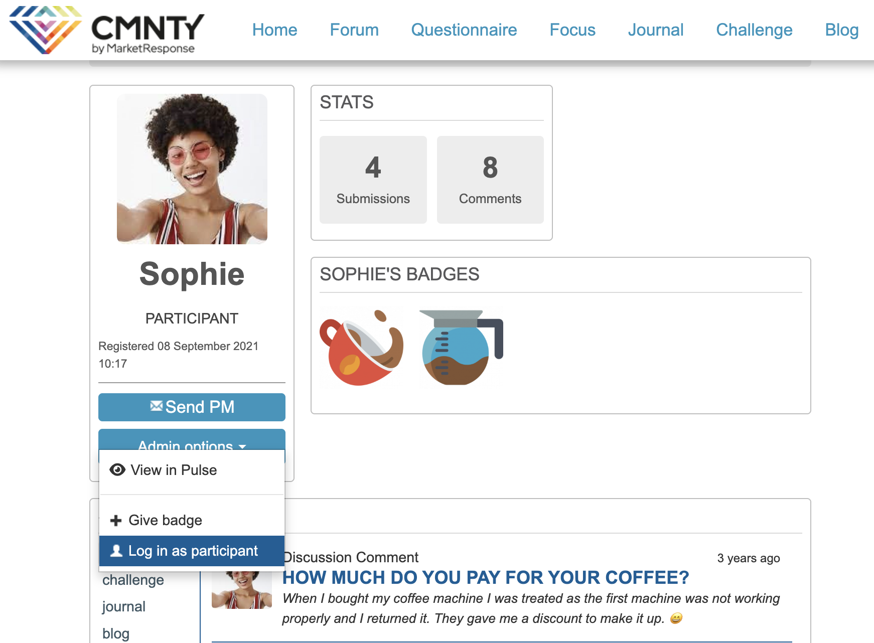 The platform view of a moderator differs from the platform view of a user. For example: as a moderator, you can see the draft items of all modules, and a participant can only view active items. Sometimes you may want to see what your platform content looks like from a user’s view. That is when the Log in as a participant function becomes handy. You can quickly log in as a user by following these simple steps: