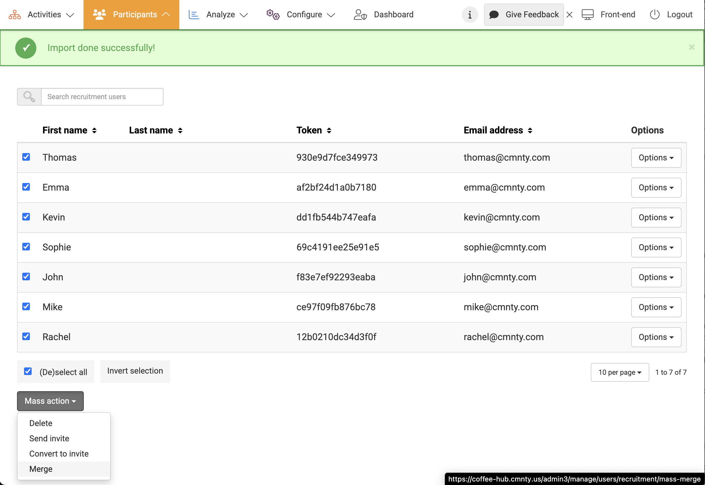 - Click Merge. The profile field will now be filled in for existing users or existing invites. When there is existing profile information, new data that is imported for merging will override the old, pre-existing data.
