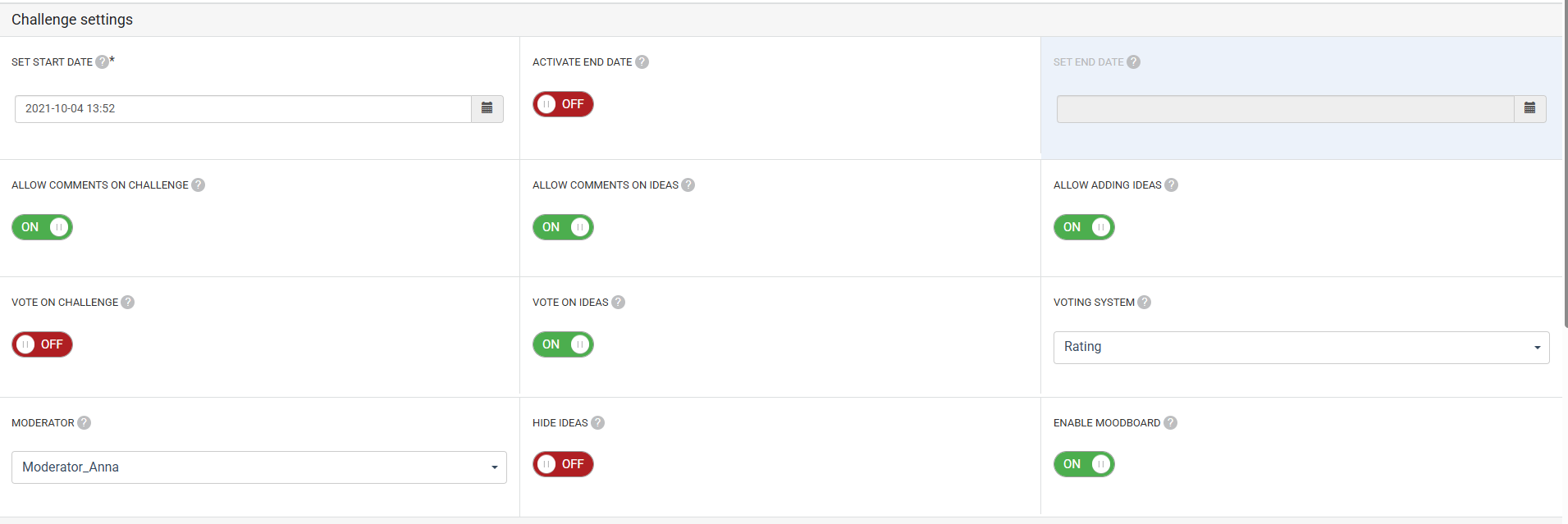 MoodBoard can be enabled per Challenge in Publish > Challenge. Whether creating a new challenge or editing an existing one, turn on Enable MoodBoard to add the Mood Board to your challenge.