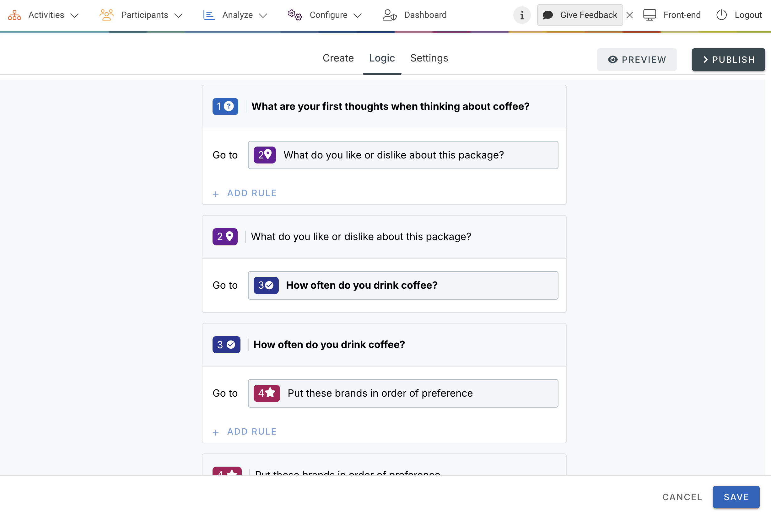 Page logic allows you to route your community members to different pages of your Questionnaire based on their responses to individual questions. You can choose to route a community member when their answer is equal to, not equal to, greater than, less than, one of the following answers, not one of the following answers, answered or not answered.