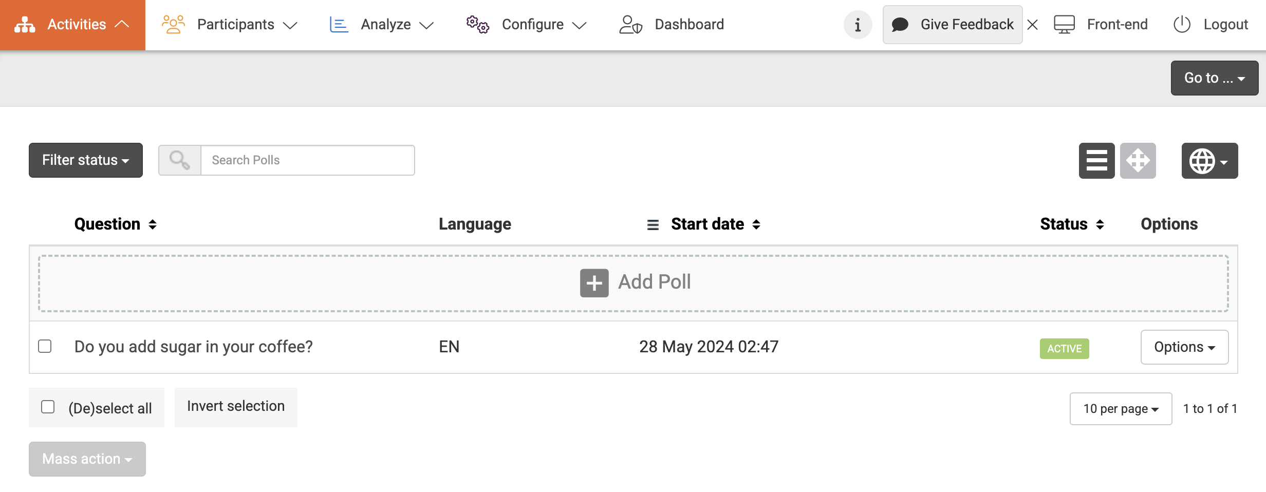 In the Admin section, you can add, edit, and delete polls. You can also view the results and change the order. If you have more than one poll, the participants will always see the first poll first, once they have completed the first poll, they will see the results of that poll and then they can continue to the next poll.