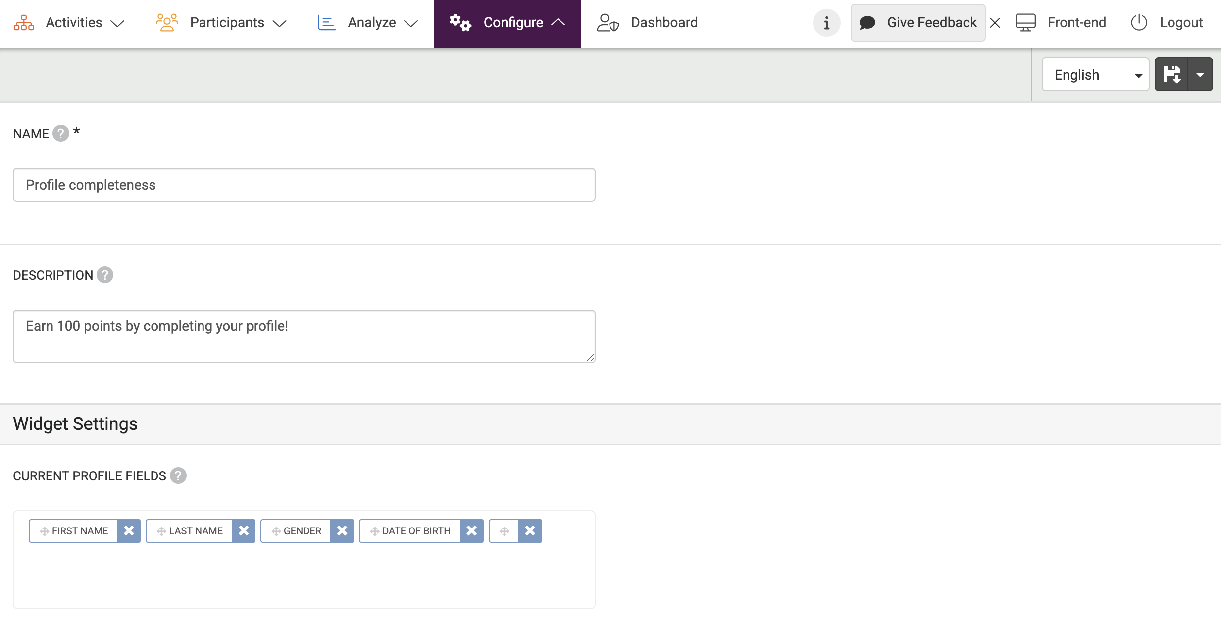 In the Admin section, you can edit the title and description of this widget and you can select the profile fields that the participant should fill in by following the steps below: