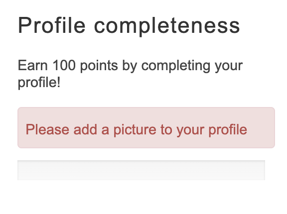 Members see a bar that shows how far they are in completing their profile page. The text in red notes which profile field the user hasn’t filled in yet.