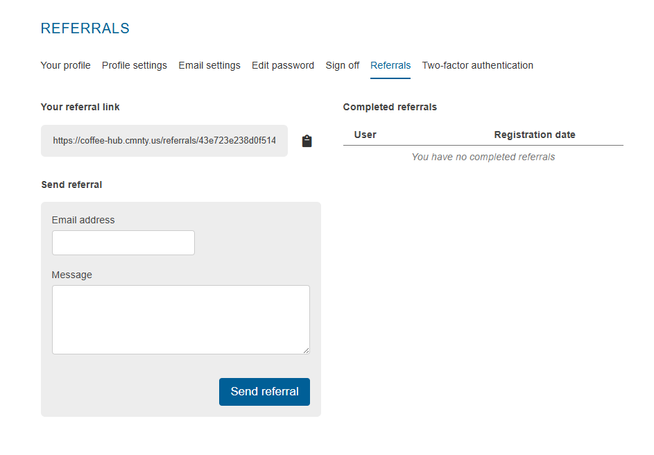 Once enabled, a user will find a referral tab in their profile settings. On this tab, 3 things should be visible;