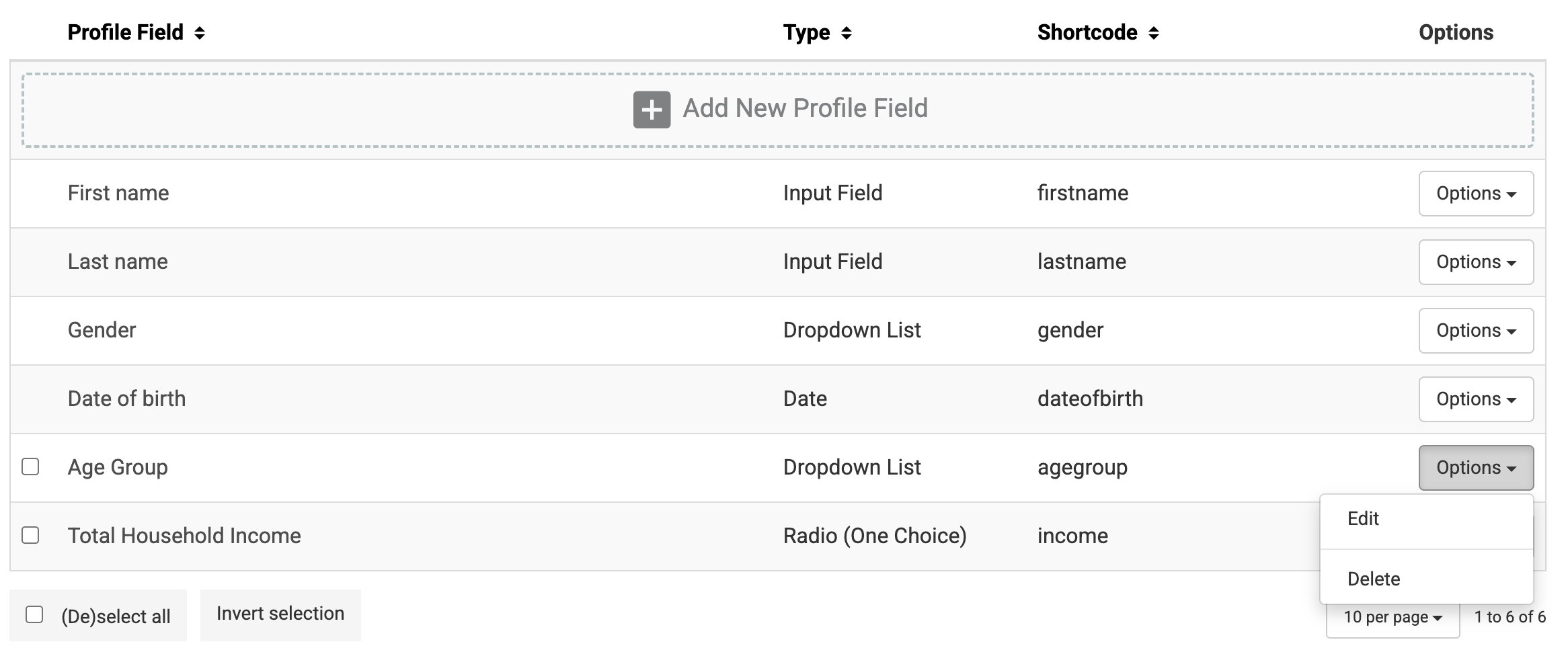 - Click the Options button of a profile field and choose Edit.