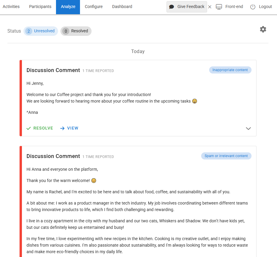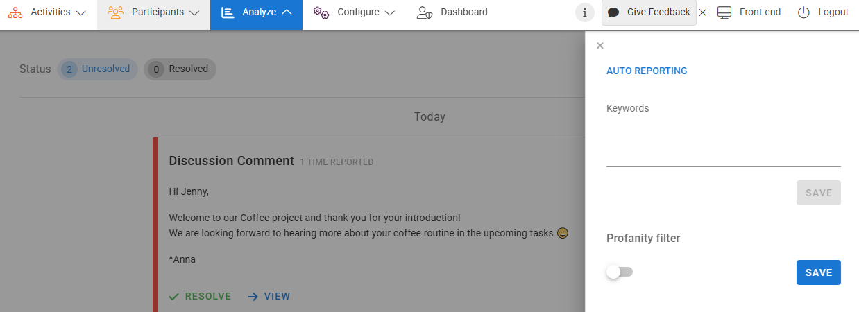 The Report feature is supported within Analyze menu where Moderators can review existing reports for resolution and set-up auto-report settings to automatically label content for review in the Reports section.