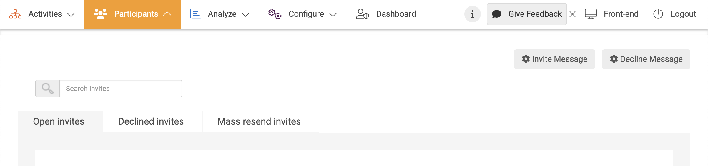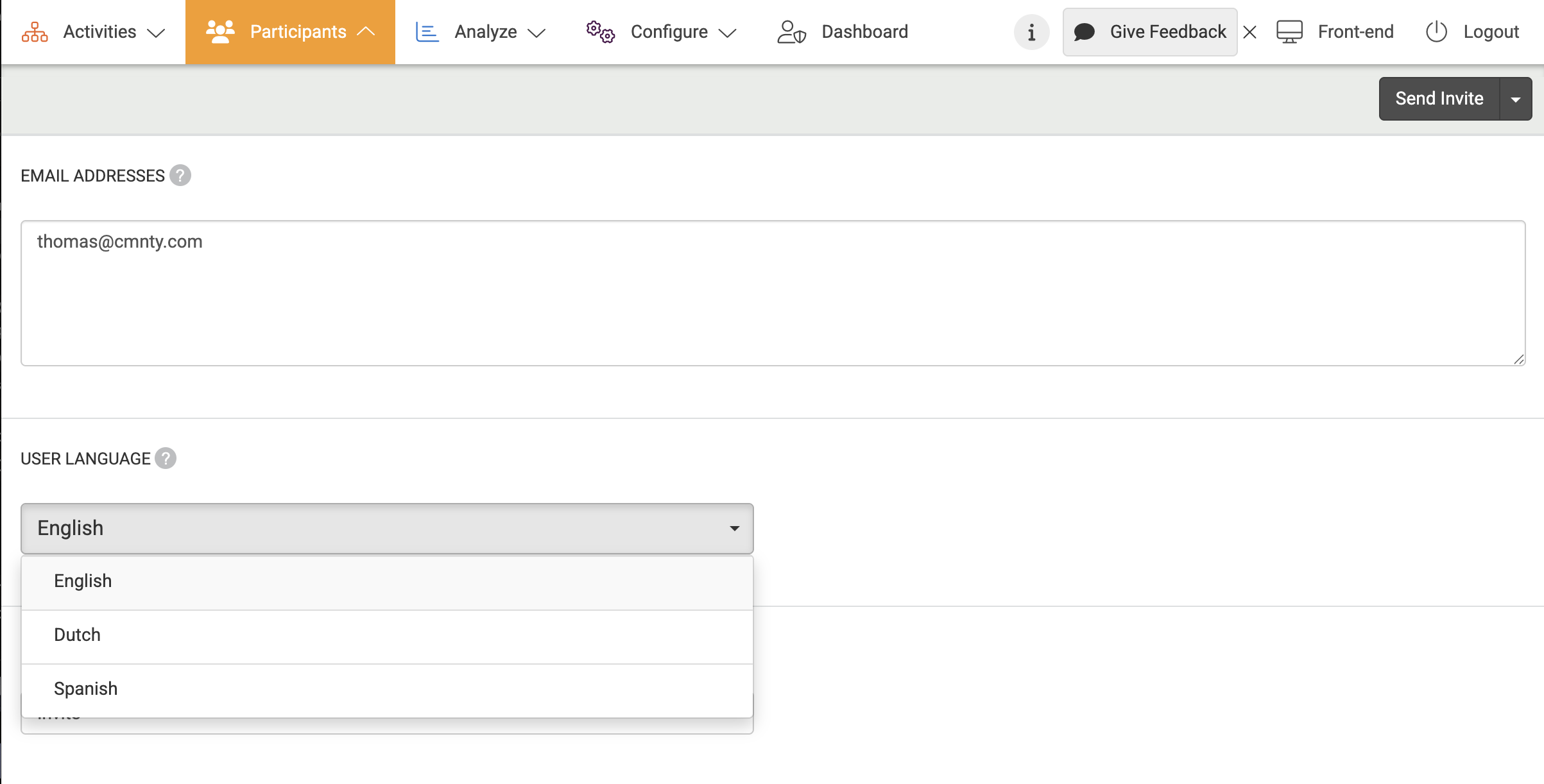 - Click Add Invite in the overview. You can fill in the email address or email addresses (separated by commas) of the participant(s) you want to invite to your platform.