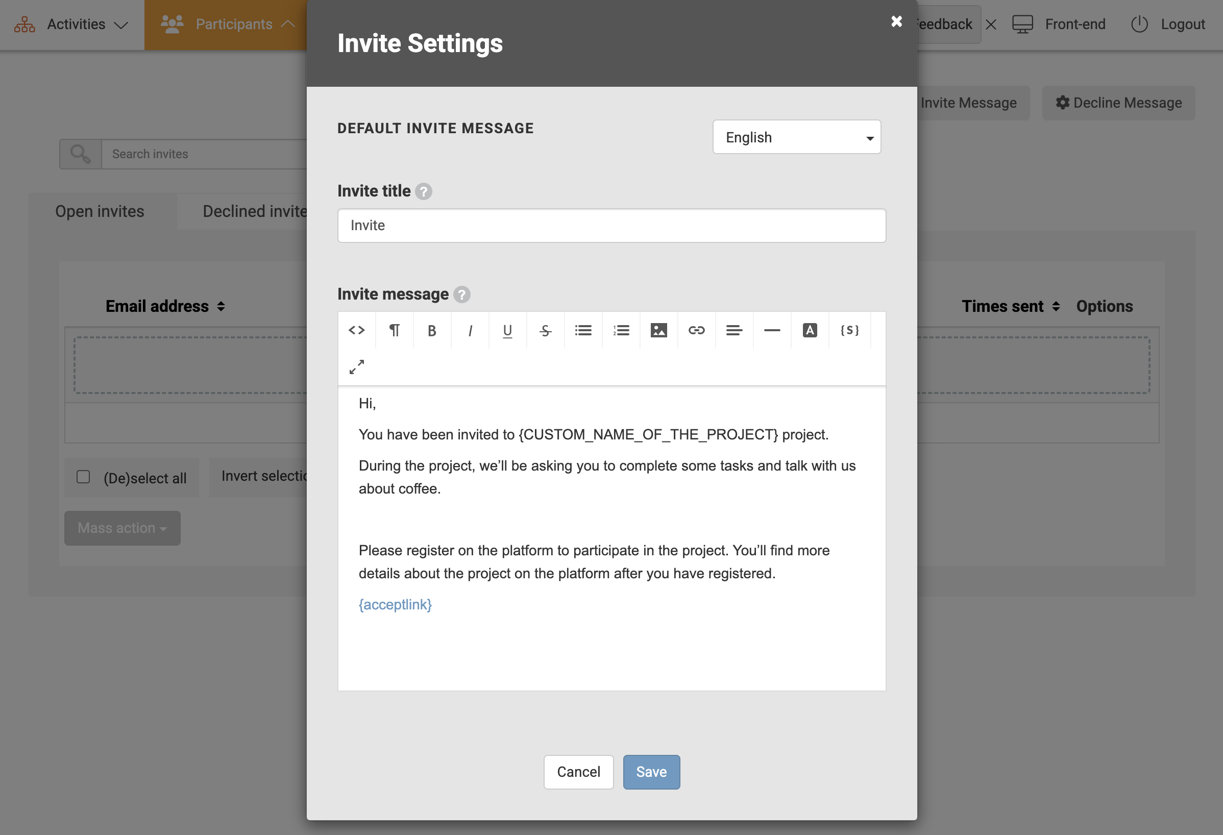 You can change the invite message for this invite, but we strongly recommend not changing or copy-paste the accept and decline links, since the link might break and the participants won’t be able to sign up. You can choose a language and update that as well. You can also include a Decline Message if you would like for the participants rejecting to join the research.