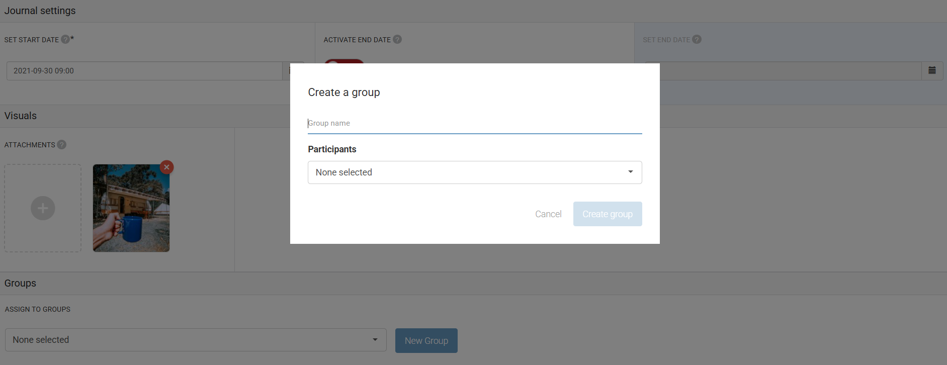 You can also create a user group from the same page of the activity/task you are creating. This is very useful when you didn’t create your group before and you don’t have to visit the Participants menu to create your group. Simply click on the blue New Group button and give your user group a name and select the participants one by one or by searching from the dropdown menu.