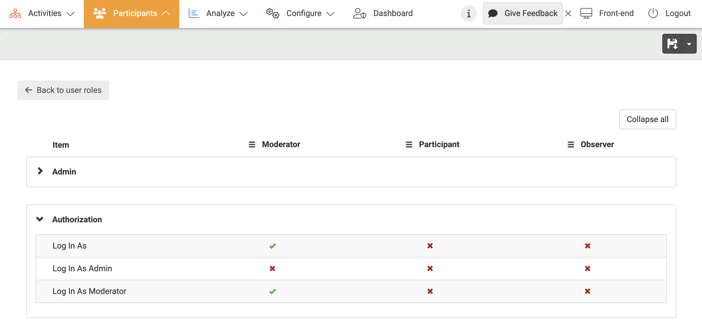 - Select the Role permissions tab. You will see a list of permissions divided by categories and several columns for different user types. You are able to see multiple user roles at once for comparison.
