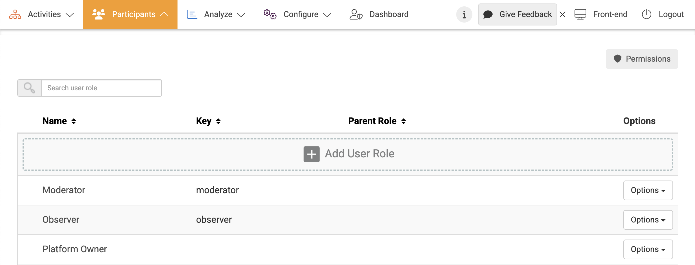 - Underneath Users, choose User Roles at the left menu and select Permissions at the top right.